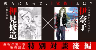 押見修造氏による『瞬きの音』第1巻が5月30日に発売され、続いて6月18日には伊奈子氏の『天女様がかえらない』第1巻が刊行予定。偶然にも同時期に最新作を世に放つこととなった両作家の対談が実現した。